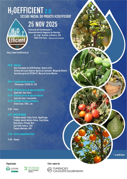 H2O Efficient 2.0 | É já no próximo dia 25 de novembro, em Évora, que se realiza a sessão inicial do projeto promovido pela Escola Superior Agrária de Santarém e o COTHN, que conta com o apoio da Fundação Calouste Gulbenkian.